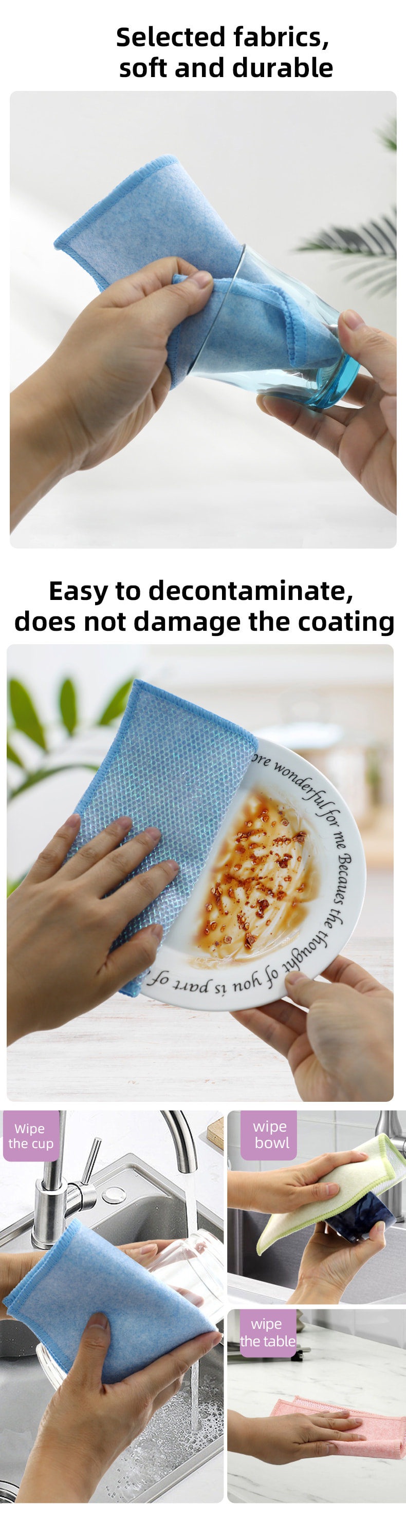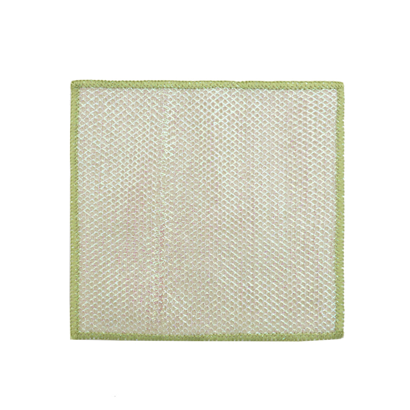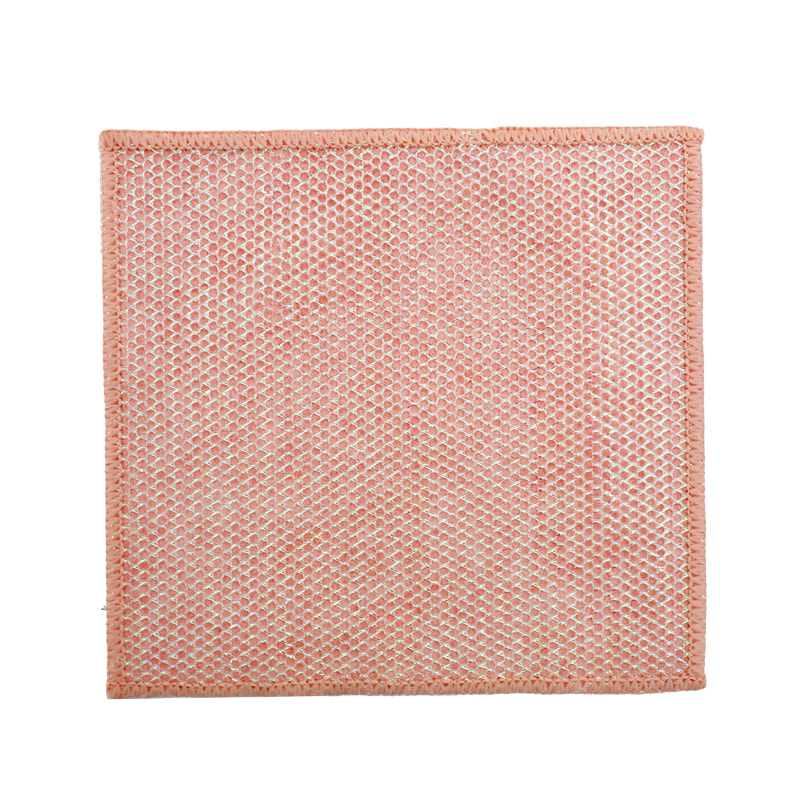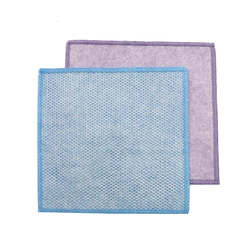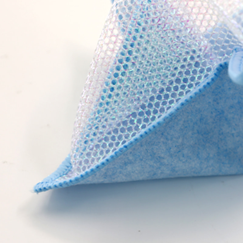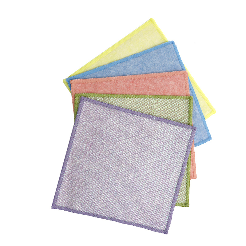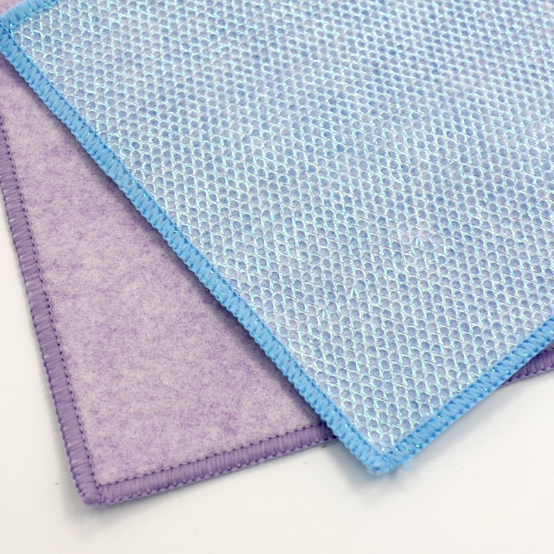 Erikoismuotoinen rakenne, värikäs, korkea ulkonäkö; Toinen puoli on värikästä puhdistusliinaa, jolla on vahva kaapimiskyky, ja toinen puoli on verkkokangasta, joka täyttää kaksi toimintoa puhdistaa kaapimisen aikana; Se on öljytön ja siinä on vahva veden imeytyminen. Toiselle puolelle on istutettu värikästä erikuvioista silkkiä ja toiselle puolelle on öljytöntä ja vettä imevää viskoosikangaspinta, joka on kaunis ja voi täyttää kaksi toimintoa, kuurausta ja hankausta toisella puolella.