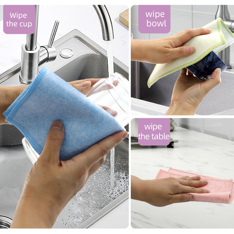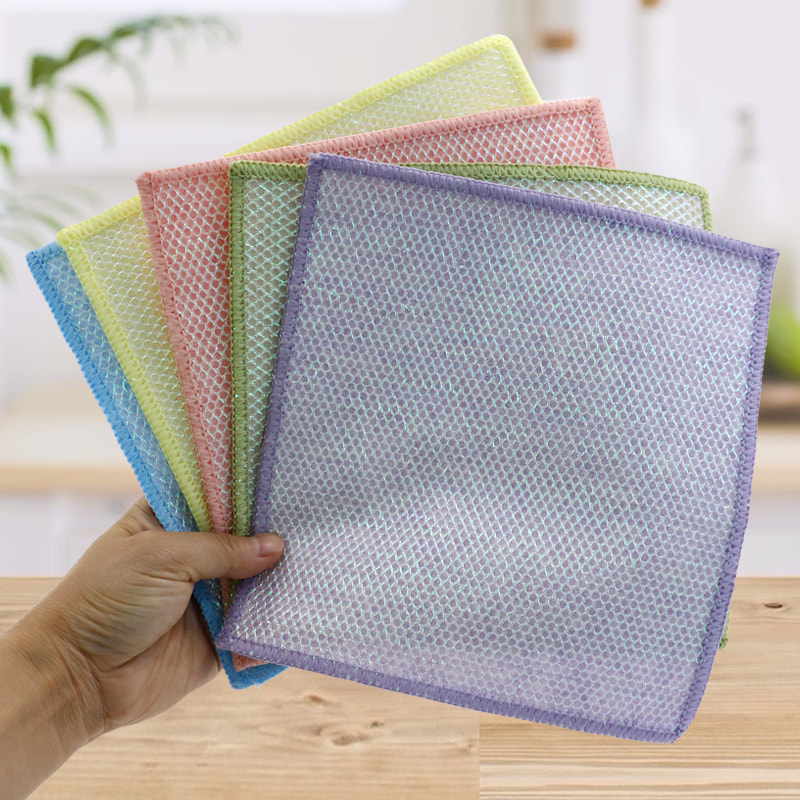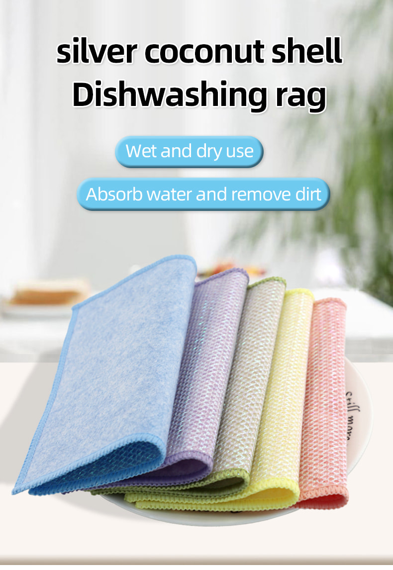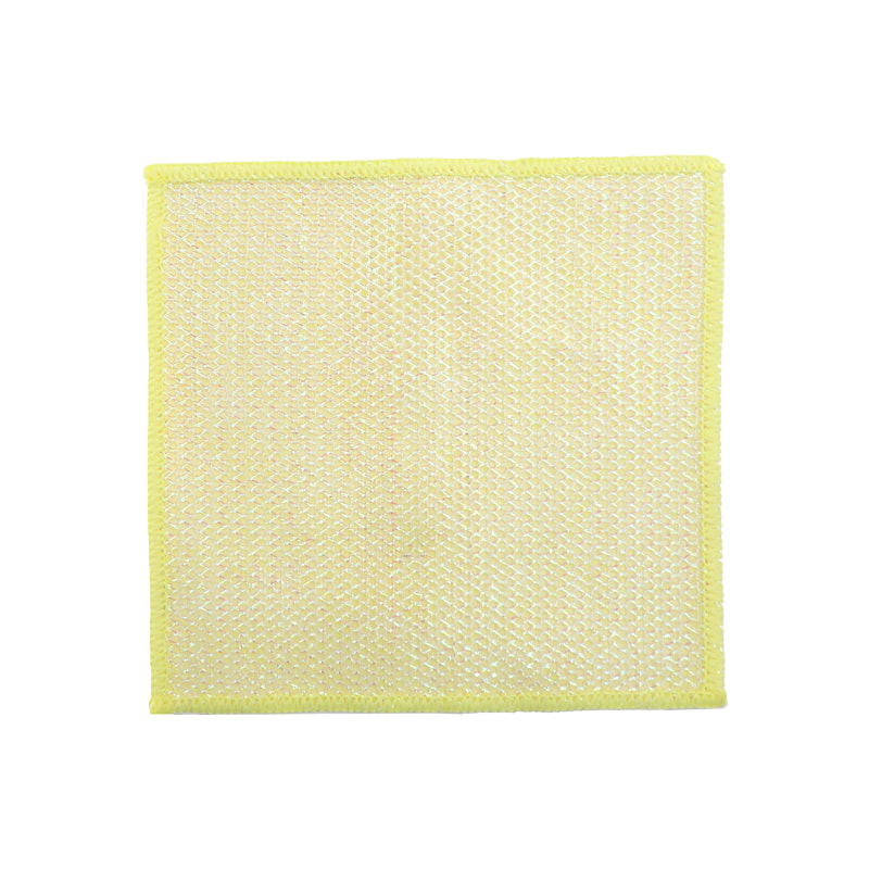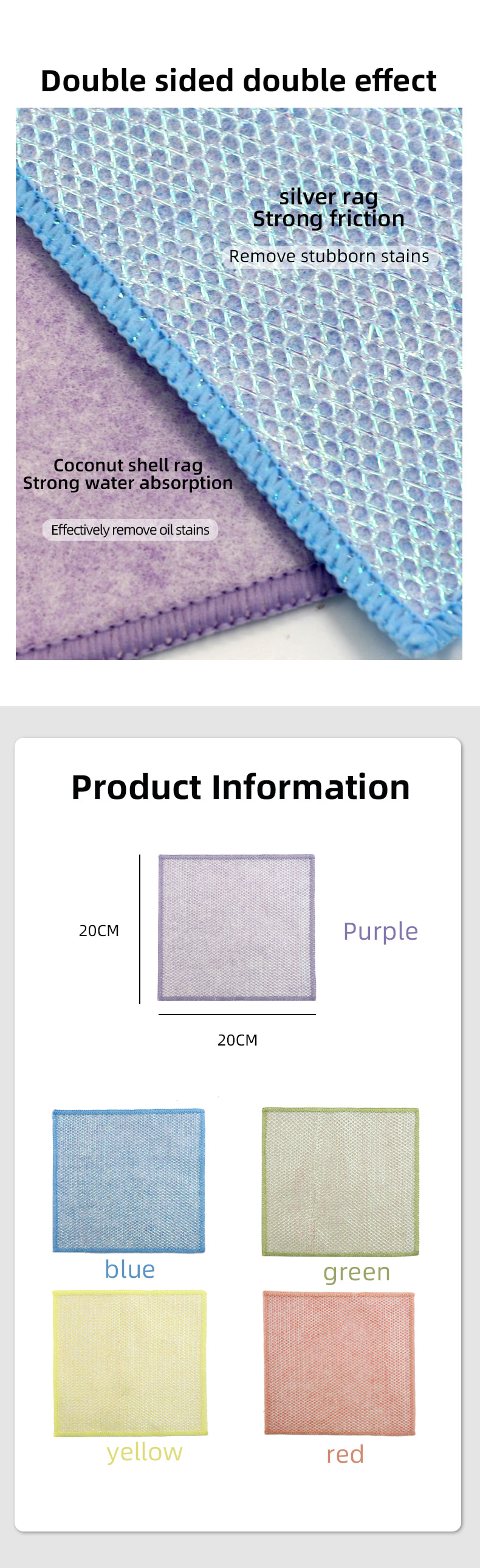 Erikoismuotoinen rakenne, värikäs, korkea ulkonäkö; Toinen puoli on värikästä puhdistusliinaa, jolla on vahva kaapimiskyky, ja toinen puoli on verkkokangasta, joka täyttää kaksi toimintoa puhdistaa kaapimisen aikana; Se on öljytön ja siinä on vahva veden imeytyminen. Toiselle puolelle on istutettu värikästä erikuvioista silkkiä ja toiselle puolelle on öljytöntä ja vettä imevää viskoosikangaspinta, joka on kaunis ja voi täyttää kaksi toimintoa, kuurausta ja hankausta toisella puolella.
