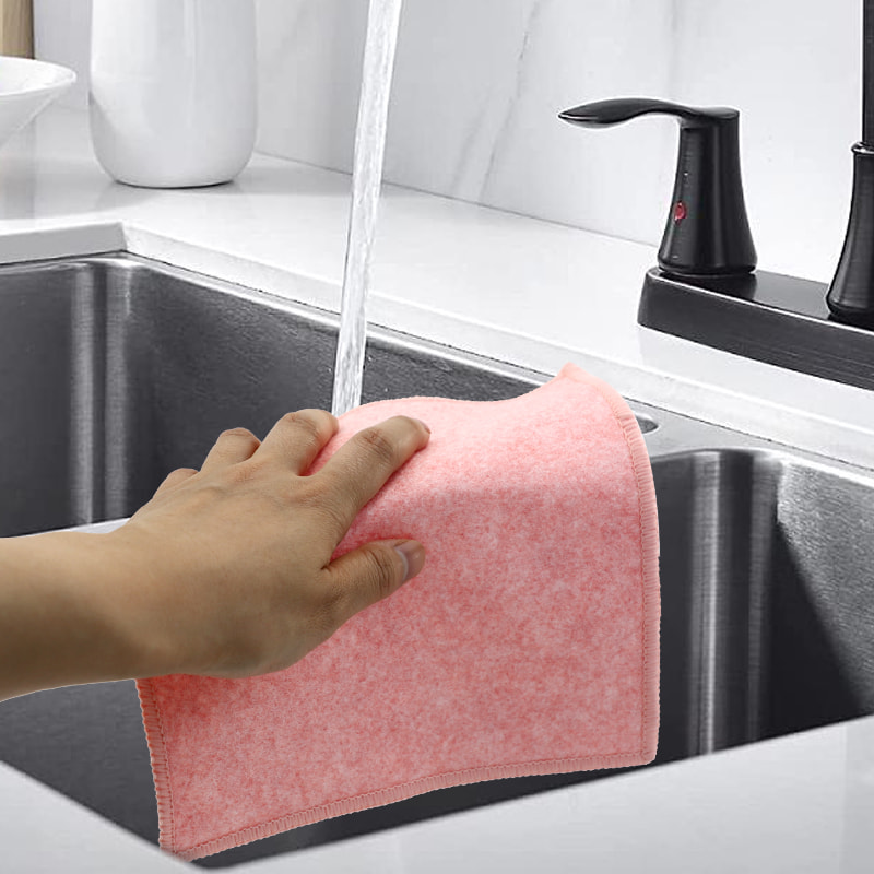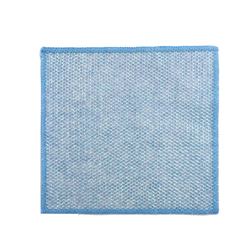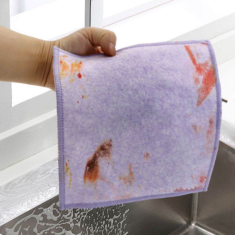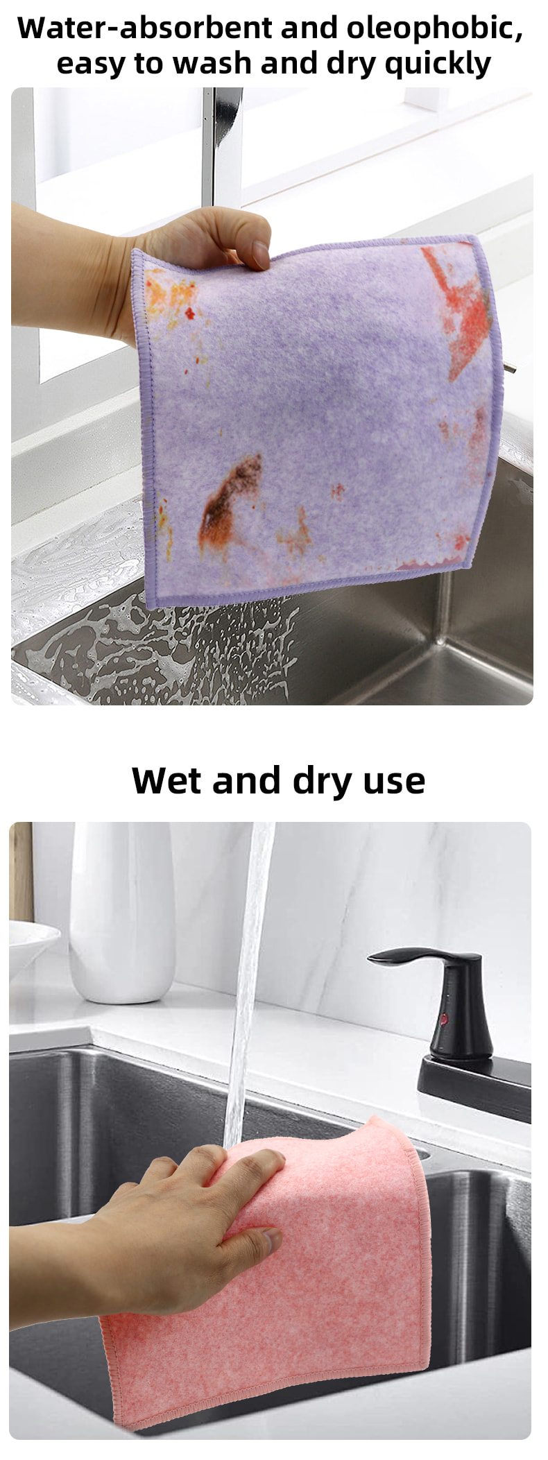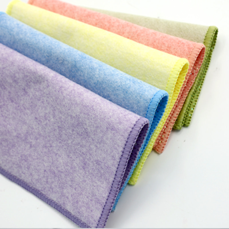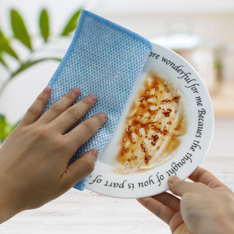 Erikoismuotoinen rakenne, värikäs, korkea ulkonäkö; Toinen puoli on värikästä puhdistusliinaa, jolla on vahva kaapimiskyky, ja toinen puoli on verkkokangasta, joka täyttää kaksi toimintoa puhdistaa kaapimisen aikana; Se on öljytön ja siinä on vahva veden imeytyminen. Toiselle puolelle on istutettu värikästä erikuvioista silkkiä ja toiselle puolelle on öljytöntä ja vettä imevää viskoosikangaspinta, joka on kaunis ja voi täyttää kaksi toimintoa, kuurausta ja hankausta toisella puolella.